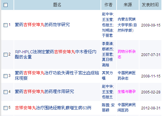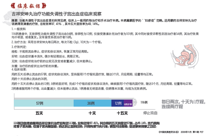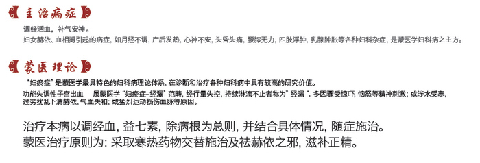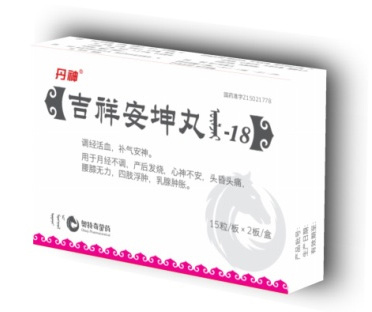 【药品名称】 通用名称:吉祥安坤丸 汉语拼音:Jixiang Ankun Wan 【 成 份 】益母草、沙棘、赤爮子、诃子、五灵脂、红花、木香、 山柰、刺柏叶、土木香、鹿茸、小白蒿、丁香、朱砂、 人工牛黄、冬虫夏草、牛胆粉、硼砂(微炒)。 【 性 状 】本品为暗红色水丸,除去包衣显浅黄色;气香,味苦、 微酸。 【功能主治】调经活血,补气安神。用于月经不调,产后发烧,心 神不安,头昏头痛,腰膝无力,四肢浮肿,乳腺肿胀。